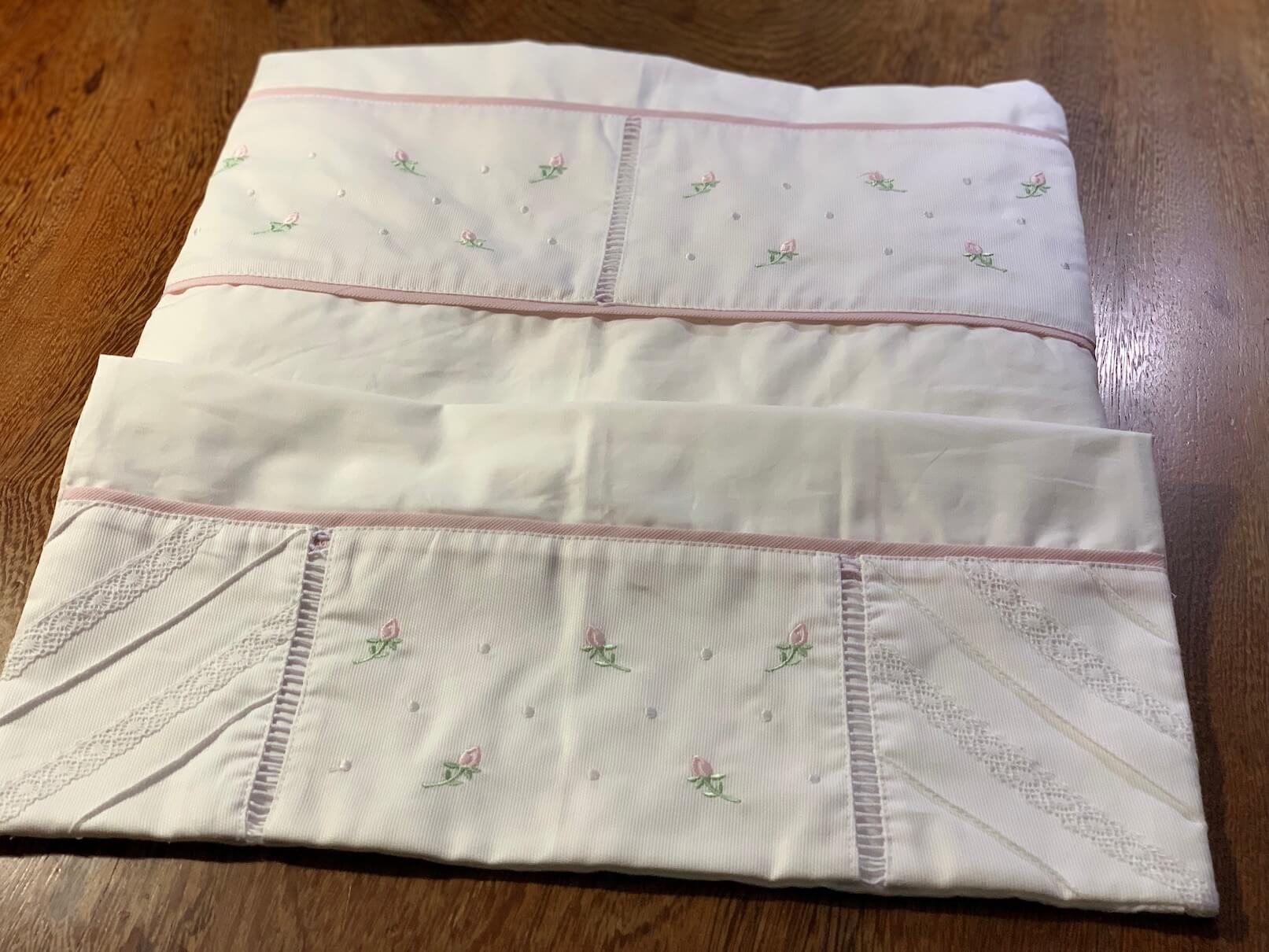 Jogo de lençol confeccionado em percal 200 fios, na cor branca, composto de lençol de elástico, detalhado com bordado nos pés (aplicado sobre tecido fustão cordonee) e fronha. É feito nas medidas de berço padrão americano de 1,35 X 0,70 metros. A fronha é decorada com nervuras, renda 100% algodão e com bordado computadorizado.