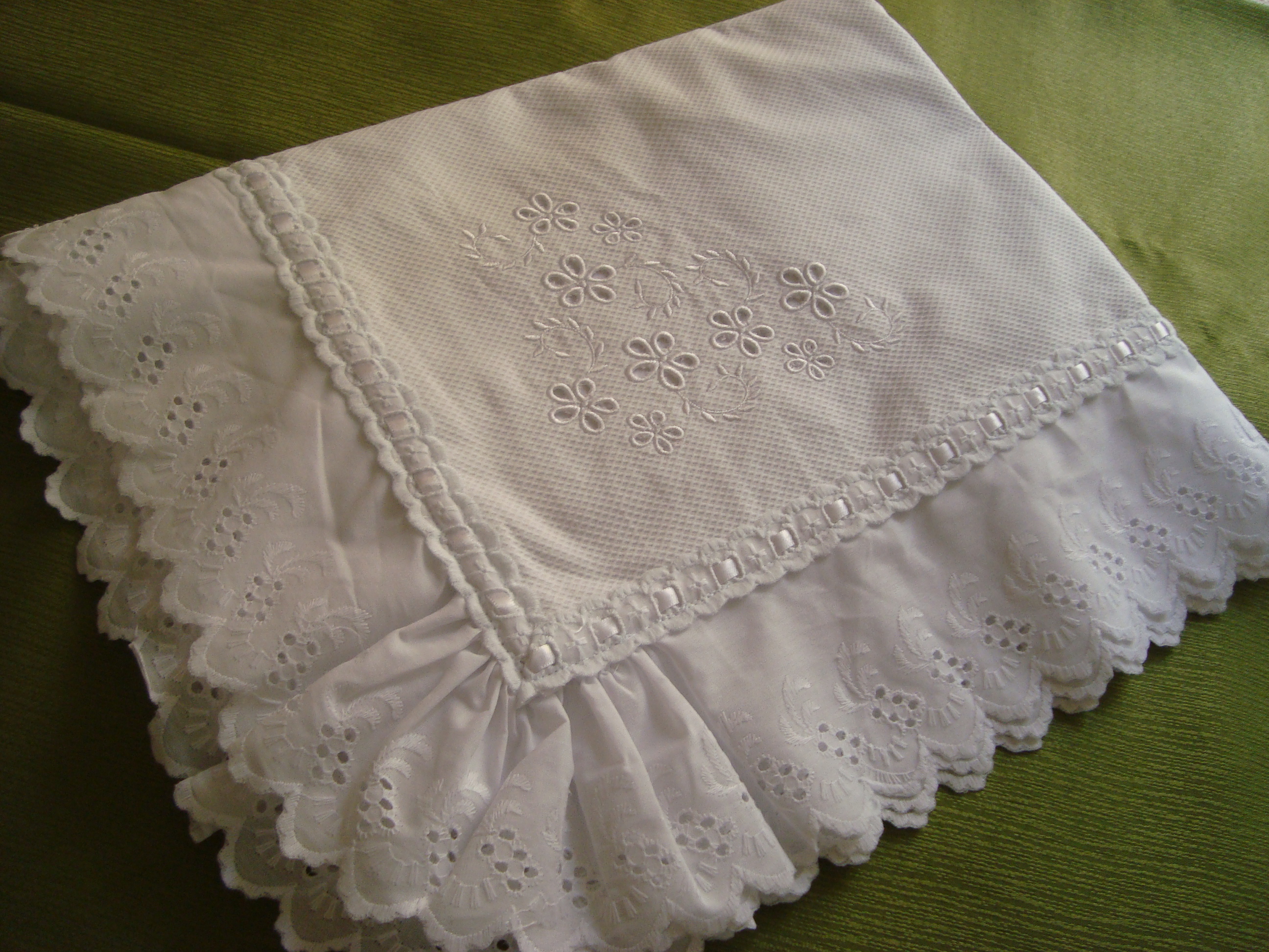 Manta confeccionada em tecido fustão casinha de abelha, 100% algodão, na medida de 1,00m X 1,00 m, decorada com bordado inglês, passa-fitas, bordado computadorizado aplicado nos 4 cantos da manta.