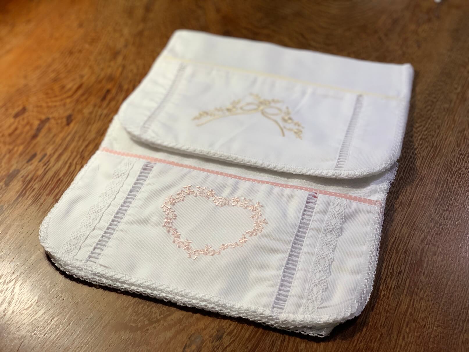 Panos de boca confeccionados em tecido fralda - marca Dohler - da maior qualidade, decorados com nervuras, renda 100% algodão e bordados computadorizados aplicados sobre tecido fustão cordonee 100% algodão. Pacote com 2 unidades.